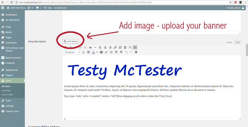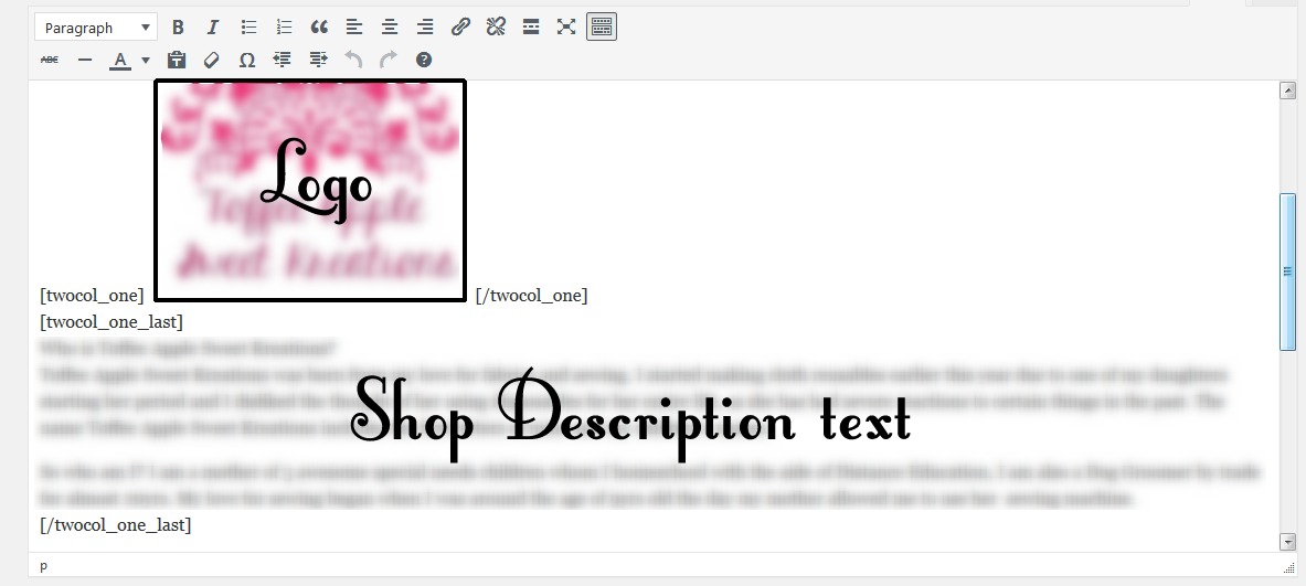 Using “column” shortcode to put a banner on one side of your text. This is a good option if your banner is square. Looks way better (IMHO) than your banner just sitting above your text, and makes your store page shorter (people see your products quicker!). If your logo has a transparent background then the page background will show through and make the image look even more fancy! Do this by putting your banner image into the first column and the text into the second column. If you have a lot of text, put some below to make the columns even (tip – you can drag the image to change the size, so that it fits the paragraphs of your text)