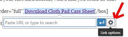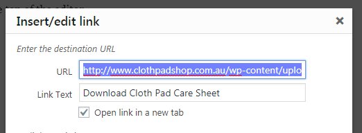 When adding links to your facebook page or other stores, please make sure that the links are set to “open in a new window” – so that customers remain on the Cloth Pad Shop site and do not leave to go to the linked site.