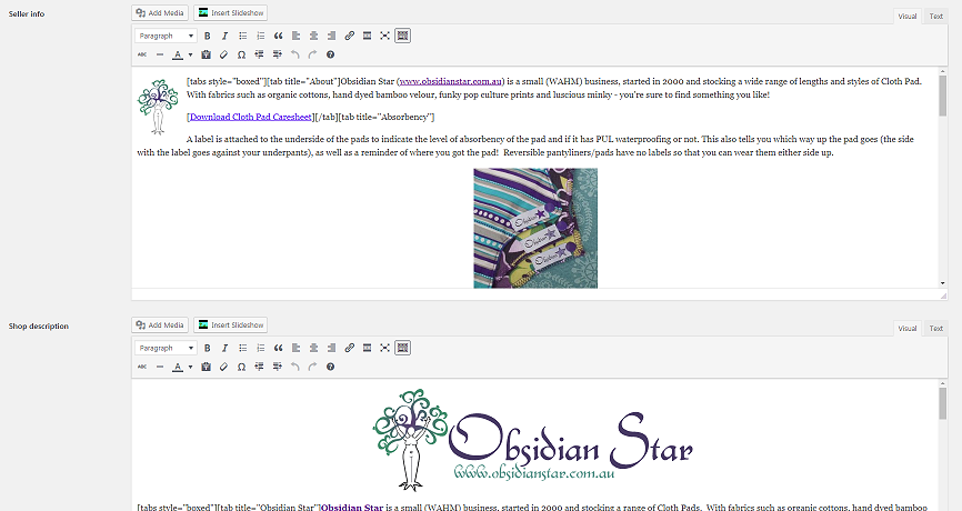 The Store Description area is where you can customise the look of your store page, with photos, links and whatever content you like. The Seller Info area is shown in product pages. Both of these are set in your store settings area. It is advised to do this on the “backend” editor as you have more options to customise the look. Note also that the order of the sections is different between the “backend” and “frontend” screens, so make sure you are working on the correct section!