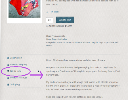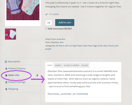 Each tab acts like a little page, allowing you to put several pages worth of content in a small space. Useful for putting in your care instructions, more details on the fabrics you use, FAQs and other things you want customers to be able to have, but don’t want it cluttering up your listings. The nice thing with the tabs is that if you keep the first tab with only a couple of lines of text, the page looks nice and neat and won’t be too far to scroll down – but you can make the other tab pages longer so that you can fit more information into them.