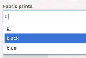 In the “backend” editor each word you have selected from the list will have a comma after it, and you need to click the “add” button to actually add them.  Once you’ve added them they are shown below (with an X which removes them if you click it).  Here you can also click the “choose from the most used product fabric prints” and it brings up a list for you.  Just click the words you want to use and it adds them for you (easy!)